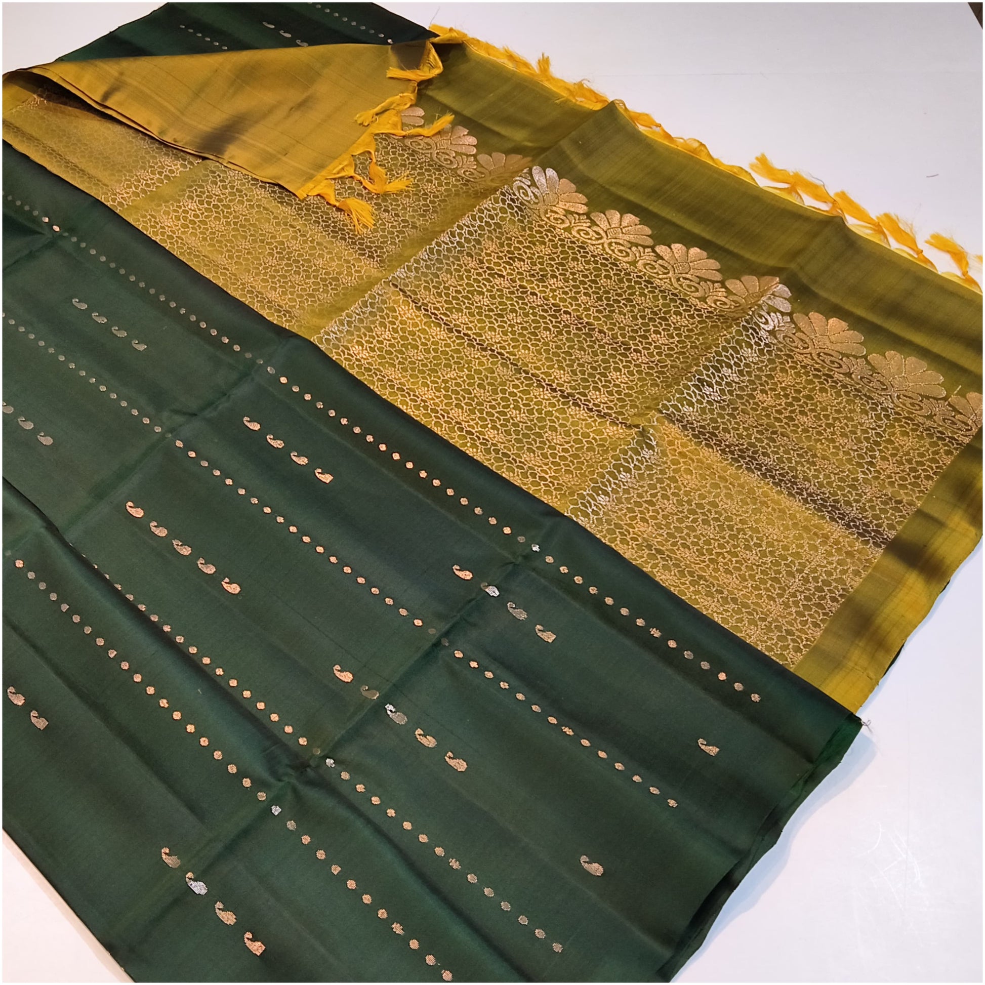Dark Green Mustard Pure Handloom Soft Silk Saree